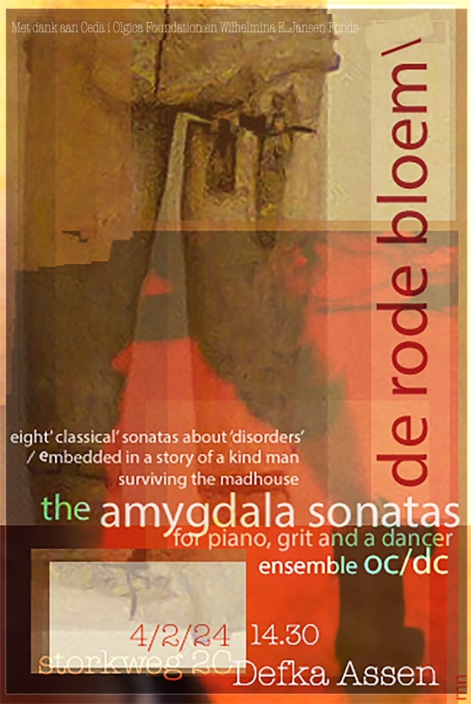 De Amygdala Sonates/deRodeBloem is een stuk voor piano, gruis en een danser, geïnspireerd op wat sommigen psychische stoornissen noemen, wij noemen het strategieën om met de allesverslindende normalitieit om te gaan….”. Muziek: Hansko Visser, Reinier van Houdt en Bas Alblas, tekst van V.Garsjin. U wordt gevraagd om ook de tapemachine te “controleren” en om de voorstelling met potlood op papier vast te leggen.